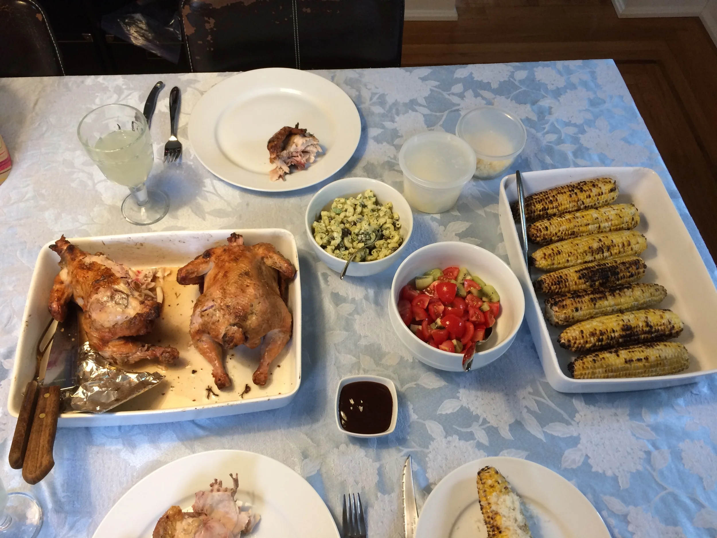 Chicken Roasted over Charcoal in the Grill with Macaroni Salad, Tomatoes Salad and Grilled Corn August 06, 2016